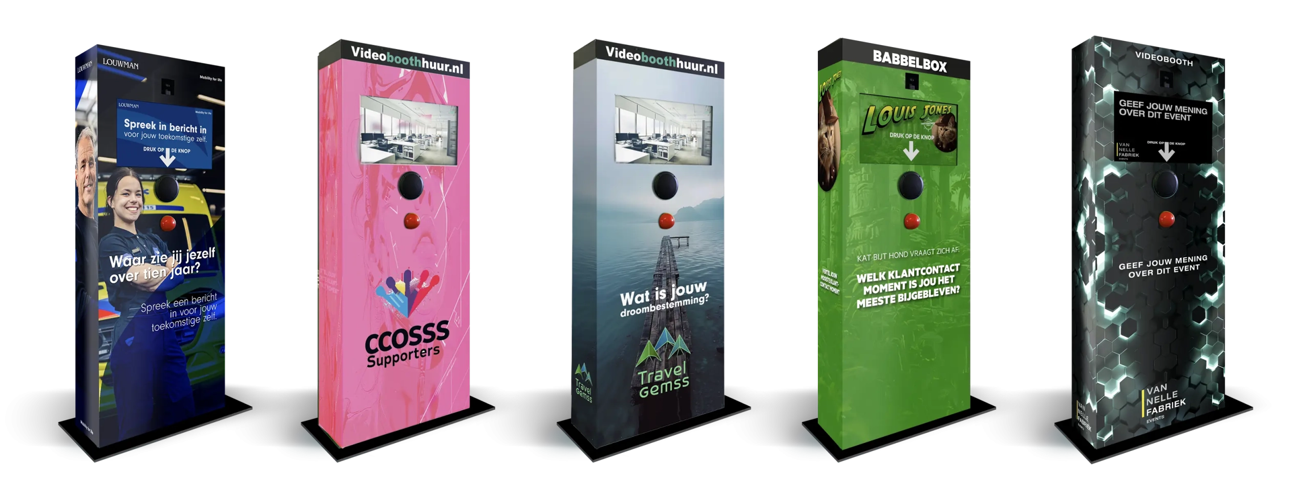 Het uiterlijk van de booth (inclusief de schermen in de box) is volledig te personaliseren in de huisstijl van jouw bedrijf.